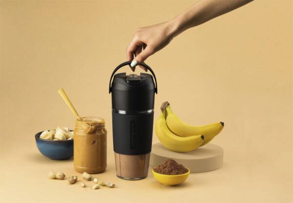 Smoothie-Maker, für unterwegs, 0,59 l Fassungsvermögen, Akkubetrieb Perfekt auch für unterwegs: ausgestattet mit einem 11.1-V-Motor verfügt der Flip über 50 % mehr Akkuleistung als die meisten tragbaren Smoothie Maker und ist in der Lage, Eis, fast alle gefrorenen Früchte und viele frische Zutaten zu leckeren Smoothies zu mixen. Isoliert.